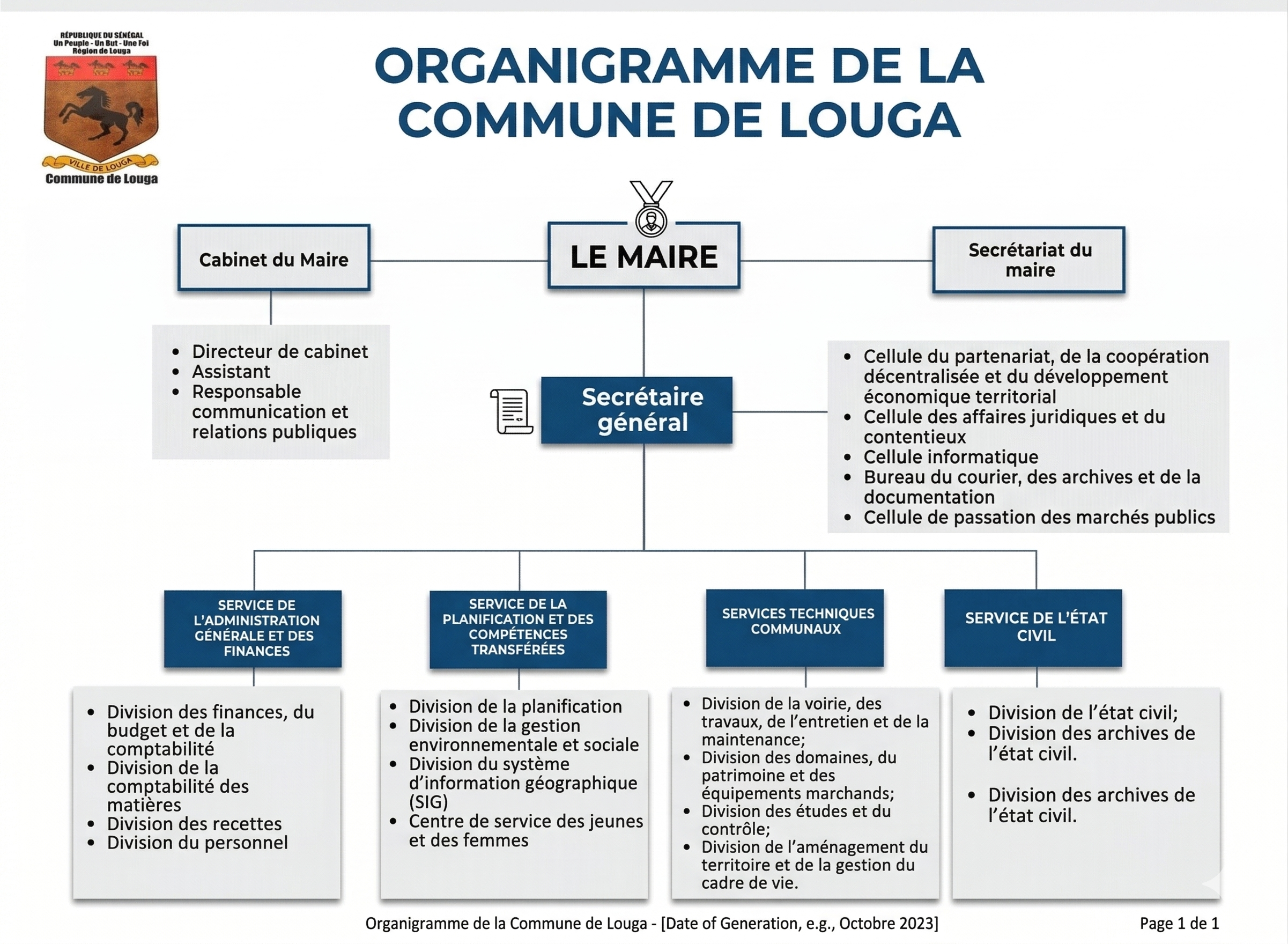 Placée sous l'autorité du Maire, l'administration de la Commune de Louga est dirigée par le Secrétaire Municipal, qui coordonne l'ensemble des divisions techniques. Chaque service contribue au bon fonctionnement de la collectivité et à la qualité des prestations offertes aux citoyens.